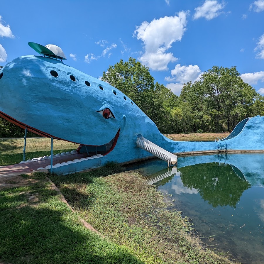 Quirky giant blue whale roadside attraction.