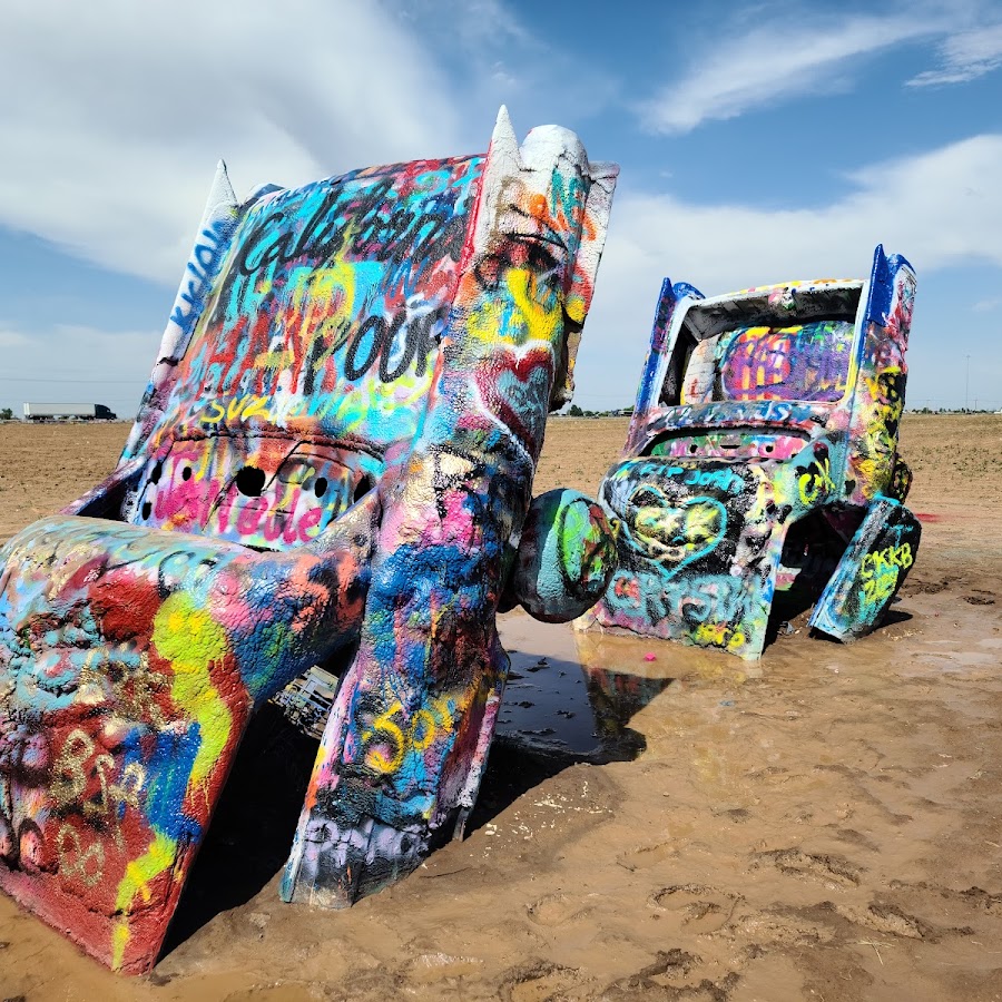Art installation with half-buried, graffiti-covered Cadillacs.