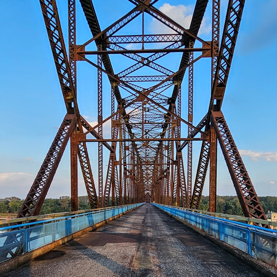 Historic Route 66 bridge with a unique bend over the Mississippi River.