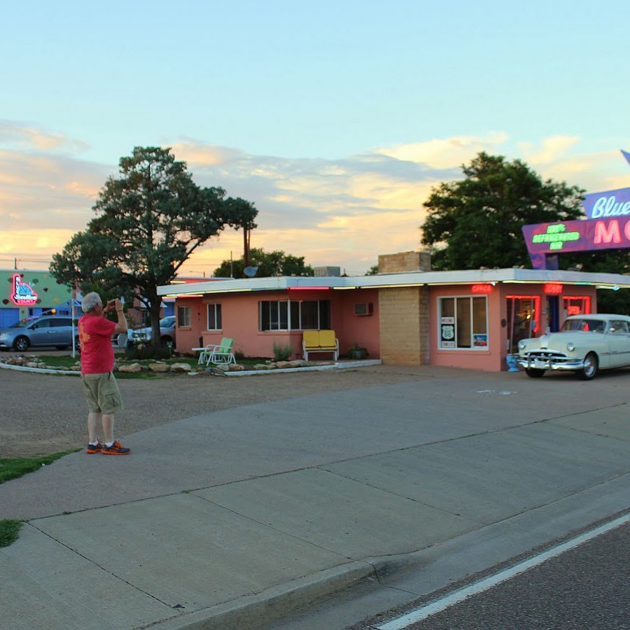Vintage 1939 motel with iconic neon signs; a Route 66 classic.